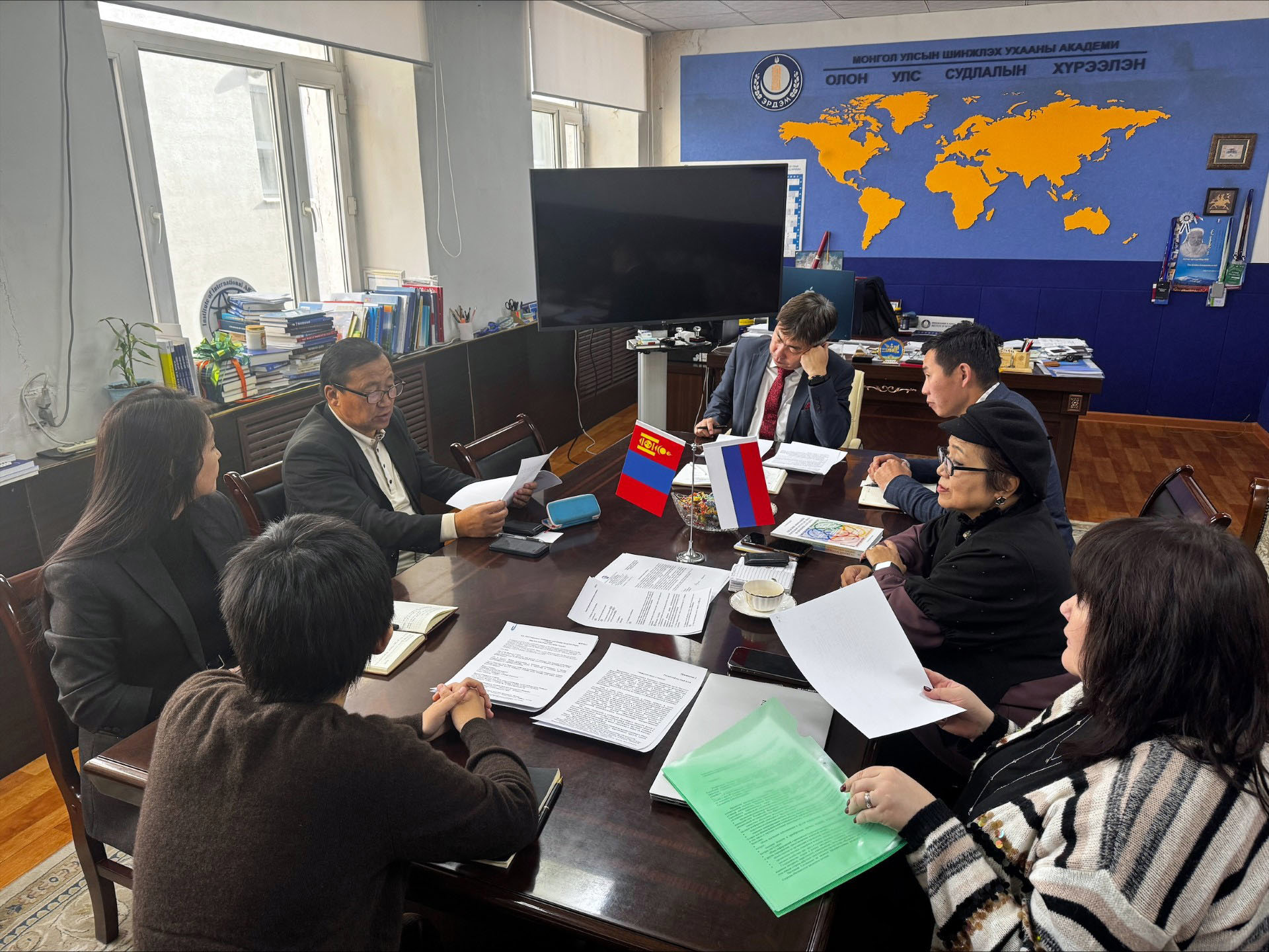 2025 оны 11 дүгээр сарын 5-ны өдөр Шинжлэх ухааны академийн Олон улс судлалын хүрээлэнгийн захирал Д.Золбоо ОХУ-ын Шинжлэх ухааны академийн Эдийн засгийн хүрээлэнгийн Аж үйлдвэр, инновацын эдийн засгийн төвийн захирал, эдийн засгийн уxааны доктор, дэд профессор Валентина Васильевна Доржиеваг хүлээн авч уулзлаа. Уулзалтад “Монголын Инновацын Холбоо” ТББ-ын гүйцэтгэх захирал, эдийн засгийн уxааны доктор (Sc.D), профессор Л.Оюунцэцэг болон тус хүрээлэнгийн Орос судлалын салбарын эрдэм шинжилгээний ажилтнууд оролцов.
