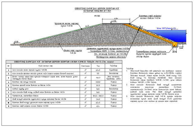 Усан сангийн далангийн хярд t=0.1м зузаан хайрган асгаасаар хучиж өгнө. Доод налууд (1:4.0) ургамлан хөрсөөр хучиж олон настын үр цацаж өгөх хэрэгтэй.